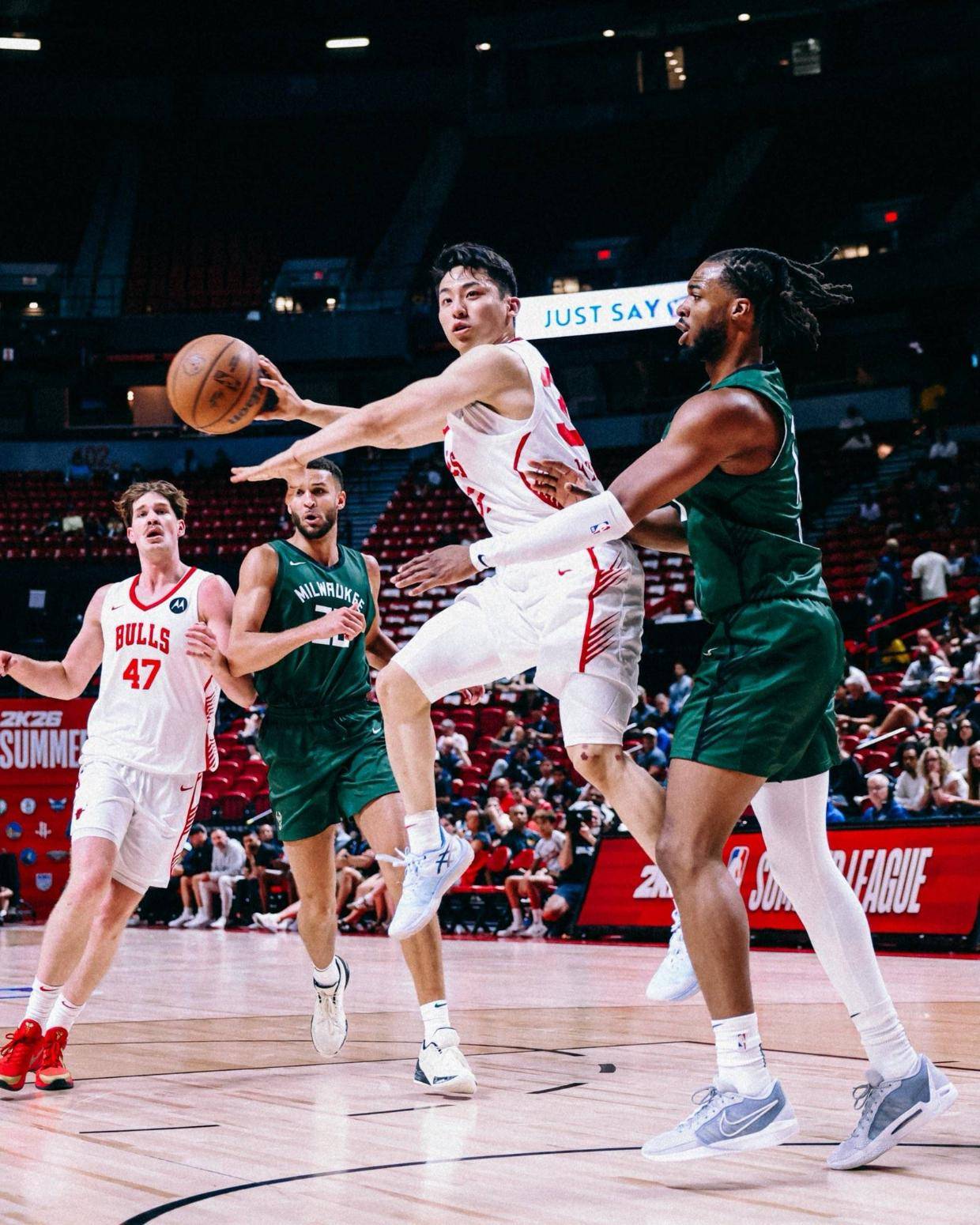 此役,雄鹿率先发力并在半场结束的时候建立起10分的领先优势。但进入下半场,公牛队凶狠反扑,末节,靠着日本后卫河村勇辉连续送出的4次助攻和命中的一个三分球,公牛打出16-2的高潮一举将比分反超。全场打完,公牛102-96逆转雄鹿。
